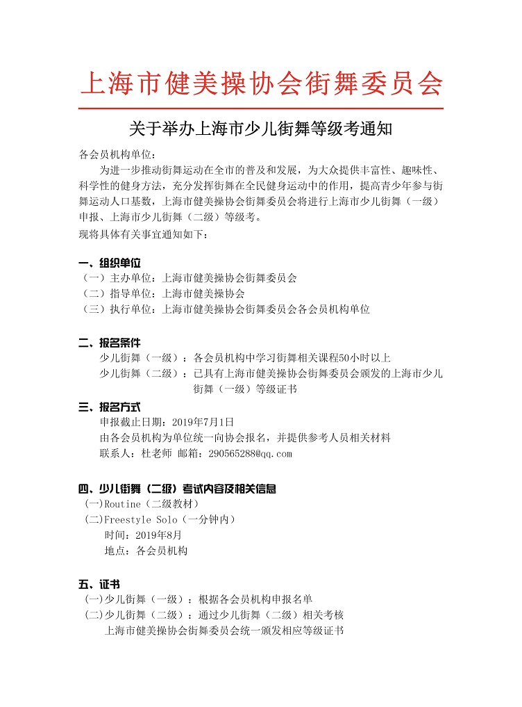 2019 上海市健美操协会街舞委员会-少儿街舞等级考(一、二级)相关通知