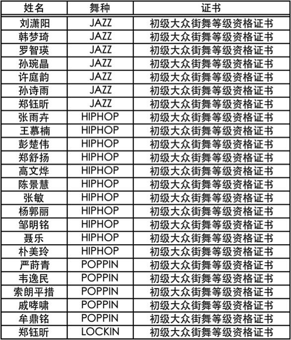 恭喜以上名单同学通过初级大众街舞等级资格考核,请尽快将两张本人一寸照片(请在背面备注姓名与通过舞种)及证书工本费交至舞社社长处,用于证书相关制作。更多具体信息请查看上海市街舞委员会官方网站: