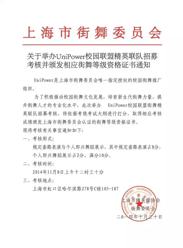 上海市街舞委员会关于UniPower高校街舞联盟招募考核颁发相关街舞等级资格证书的通知: